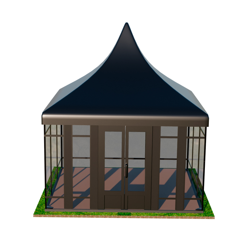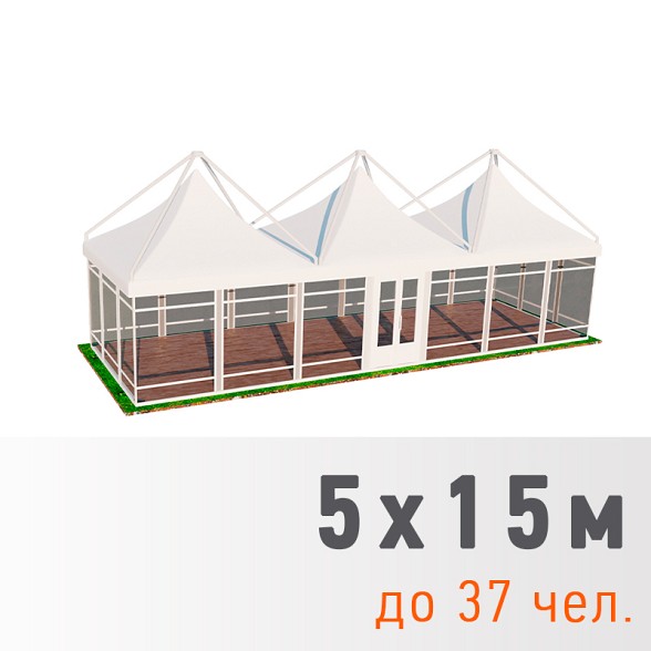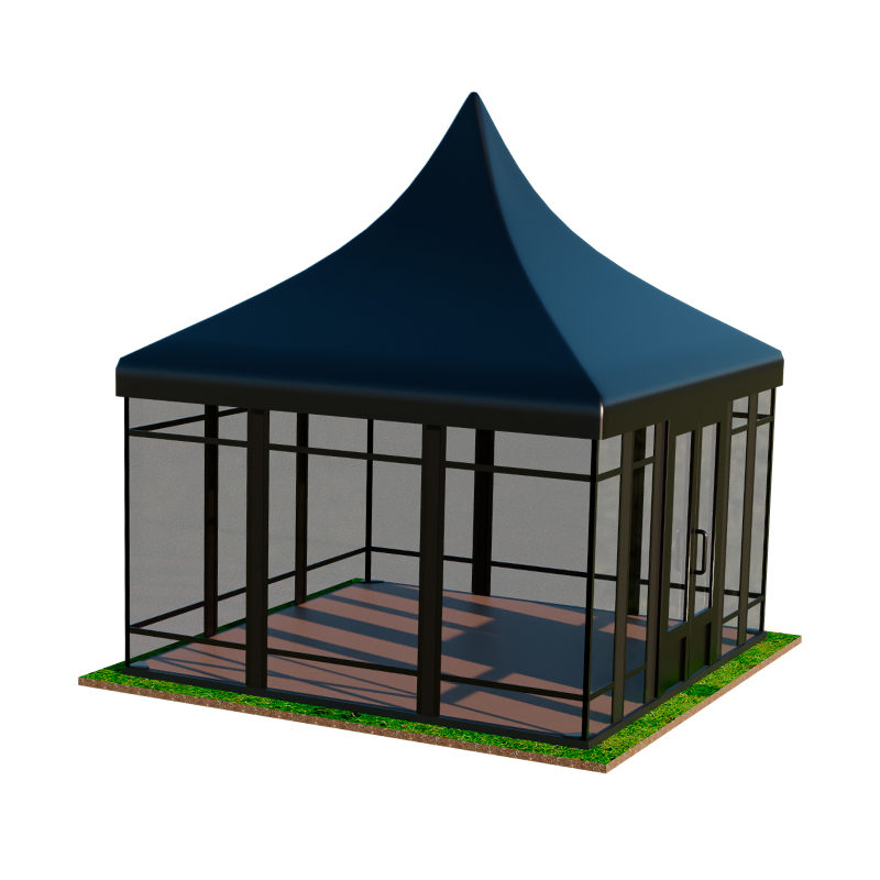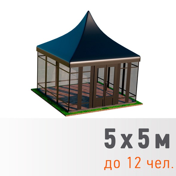 Пагода Лондон — премиальная серия с усиленным каркасом и возможностью остекления. Доступны модели 5×5, 5×10 и 5×15 метров как в стандартном исполнении (28 500 — 82 500 рублей), так и с панорамными окнами (57 500 — 147 500 рублей). Остекленные варианты обеспечивают защиту от ветра и сохраняют видимость окружающего ландшафта.