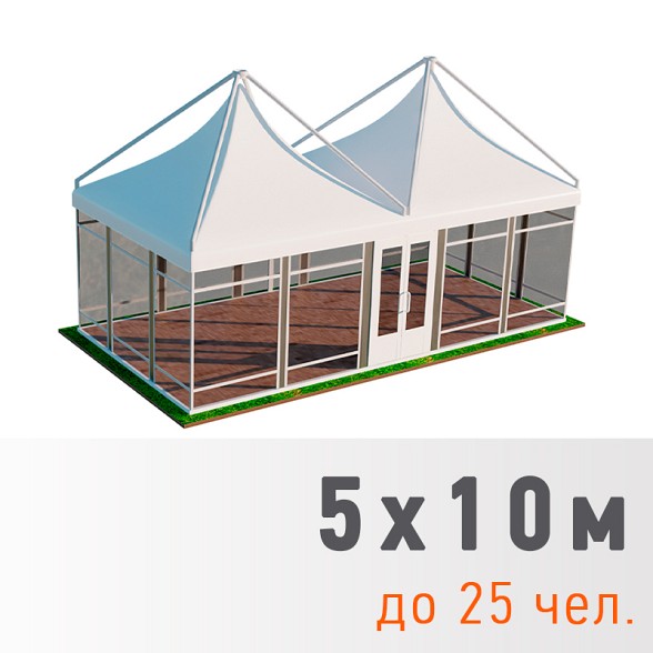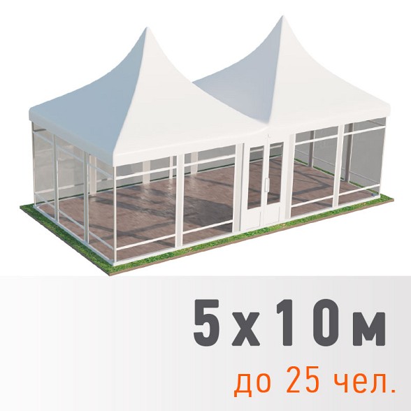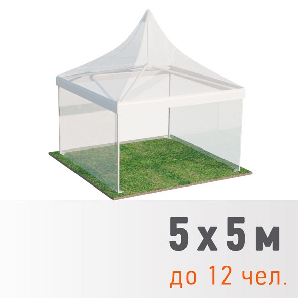 Прозрачные и павильонные пагоды — специализированные модели с прозрачными стенками или полностью открытой конструкцией для банкетов и выставок. Шатер «Прозрачный» 5×5 м стоит 24 000 рублей, а павильонные версии 5×5 и 5×10 м — от 45 000 до 62 500 рублей.