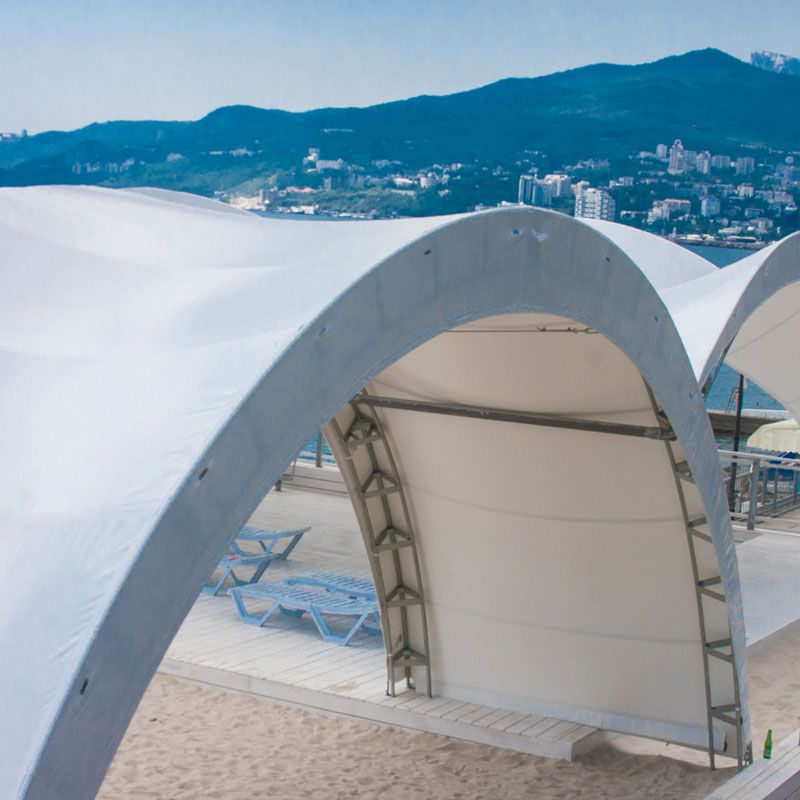 Мобильность системы позволяет произвести быстрый монтаж без специальной подготовки грунта, а возможность стыковки нескольких модулей дает возможность создавать масштабные тентовые комплексы. Для создания максимального уюта внутреннее пространство легко оснащается системами освещения, напольными покрытиями и климатическим контролем.