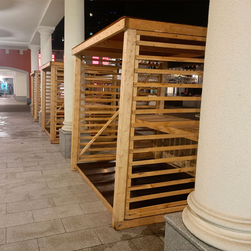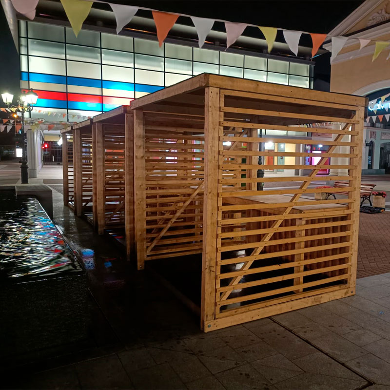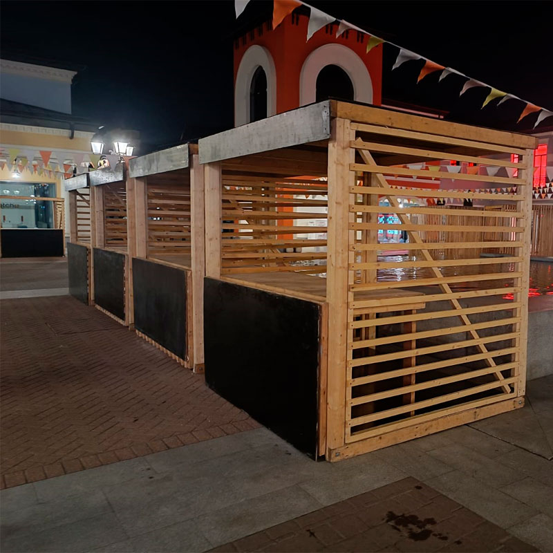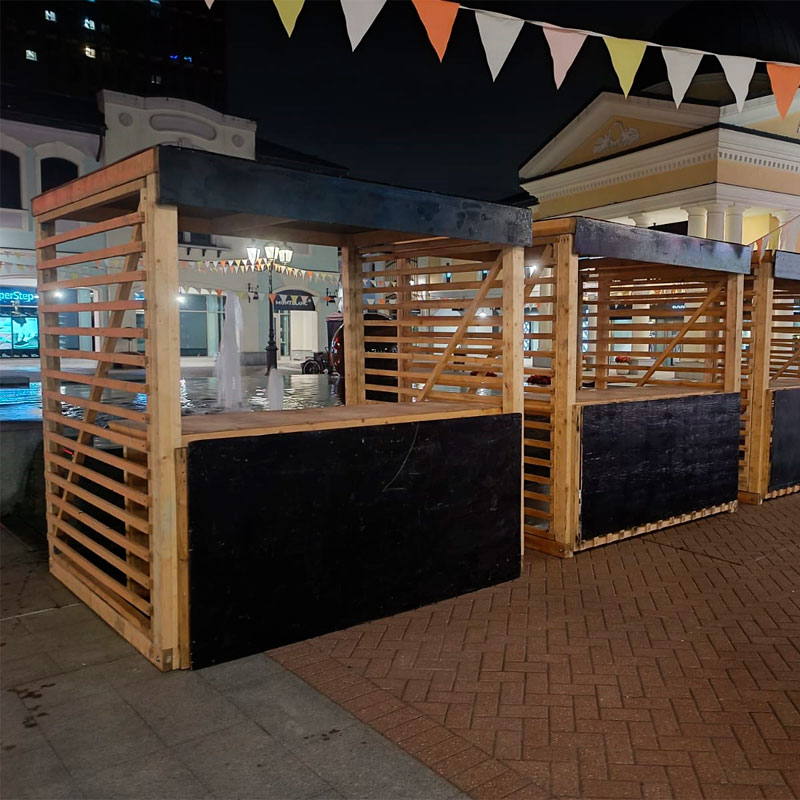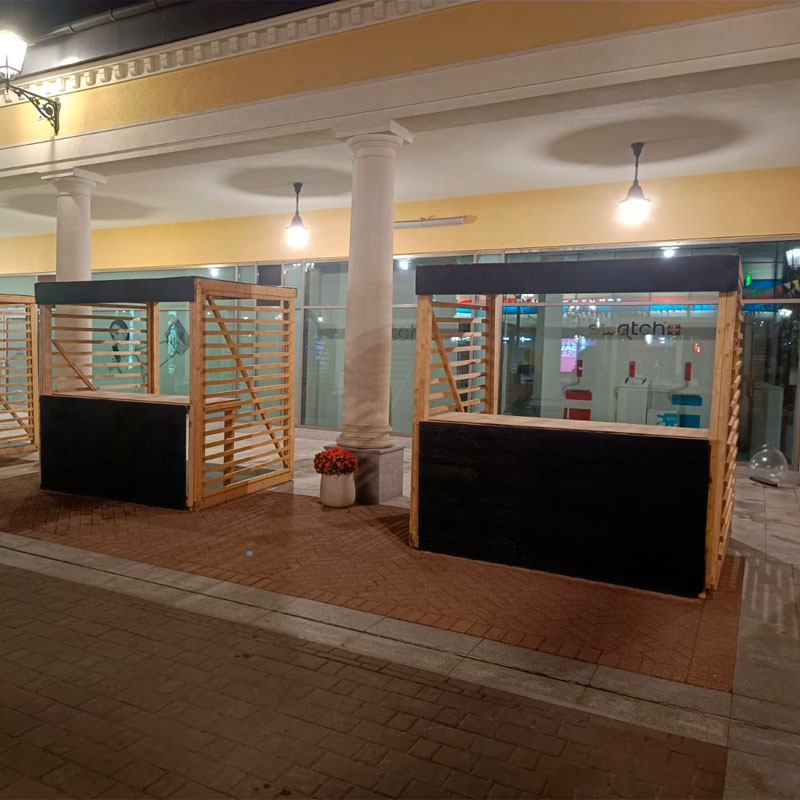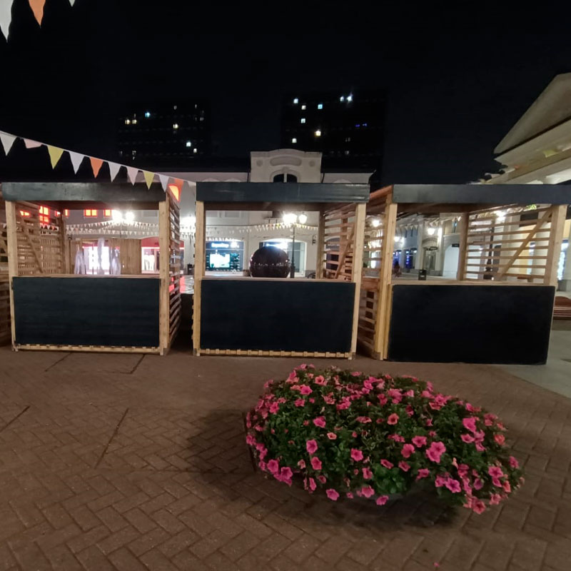 Предлагаем в аренду универсальные деревянные киоски размером 2х2 метра, которые станут идеальным решением для организации торговых точек и зон питания на любых площадках. Благодаря своей компактности и мобильности, эти конструкции легко устанавливаются как в закрытых помещениях (торговых центрах, вокзалах), так и на открытом воздухе.