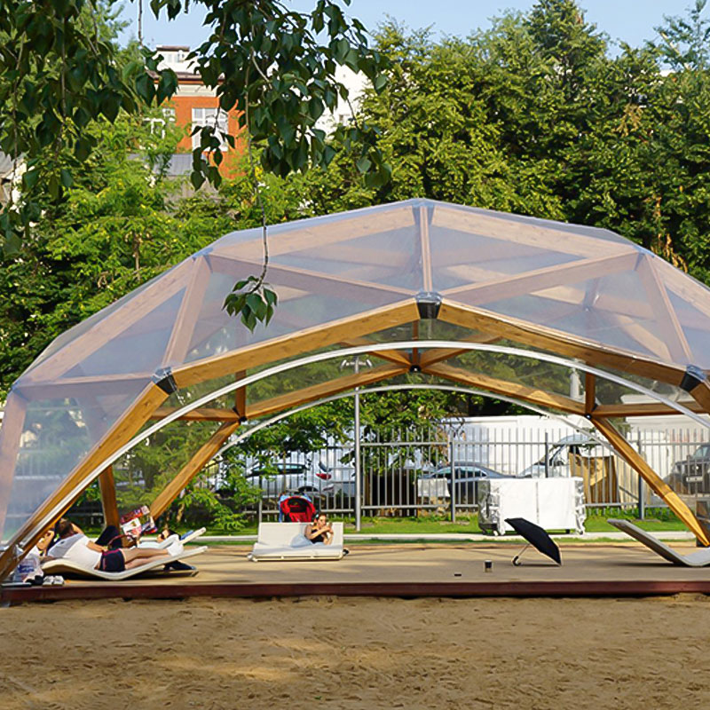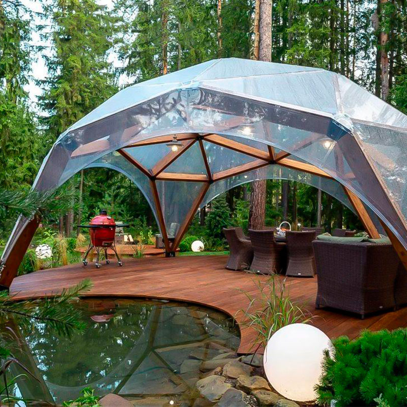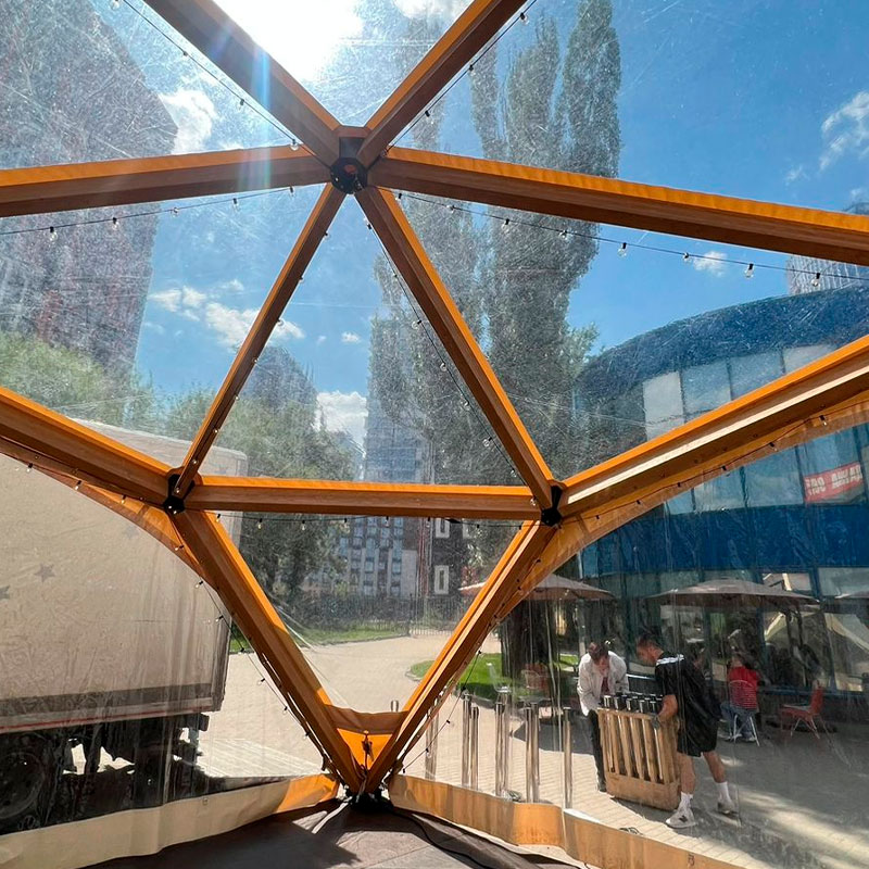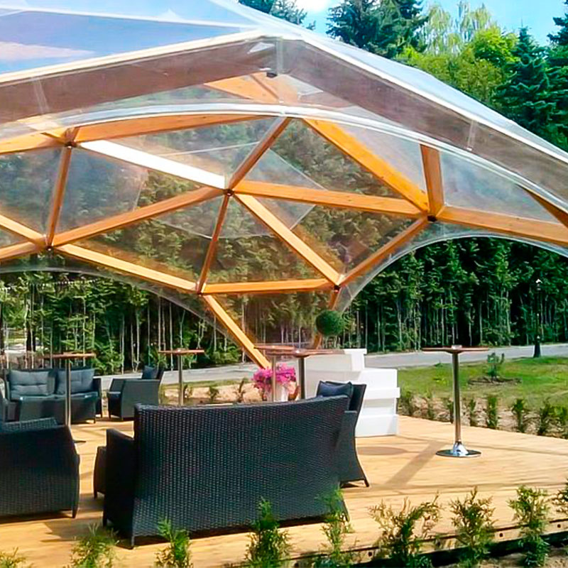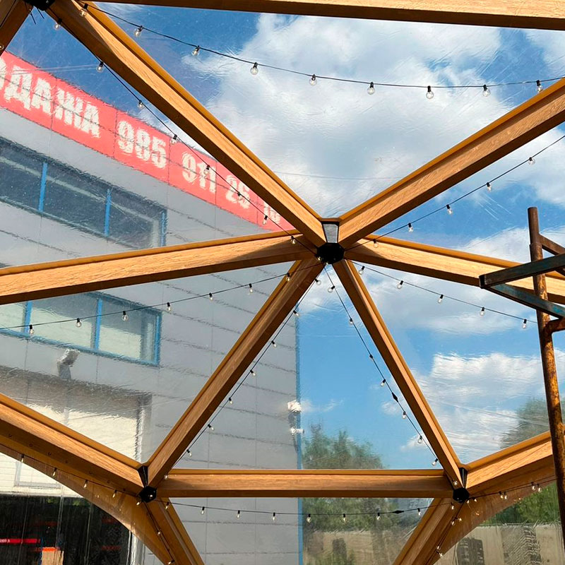 Предлагаем в аренду уникальный деревянный шатер 6х6 с полностью прозрачным покрытием, который станет изысканным украшением любого события на свежем воздухе. Конструкция базируется на прочном каркасе из высококачественного клееного бруса и усиленной металлической фурнитуры, что гарантирует исключительную устойчивость даже при сильных порывах ветра. Прозрачные стенки создают эффект открытого пространства и могут служить эффектной витриной для торговых павильонов или выставочных зон.